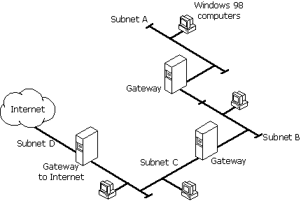 For this type of network, you must obtain a network ID that is valid on the Internet. You must also configure a gateway to reach the Internet, and each computer needs the address of the gateway in order to reach the Internet. A Windows 98 computer cannot be configured to act as a gateway.
