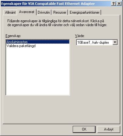 Jag har ställt ner nätverkskortet med avsikt till 10Mb halv duplex för att minska problemen med en USB hårddisk