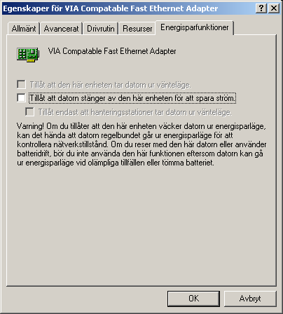 Att låta datorn stänga av nätverkskortet för att spara ström leder för det mesta till problem